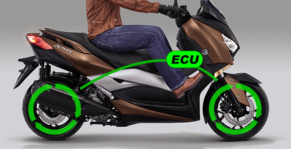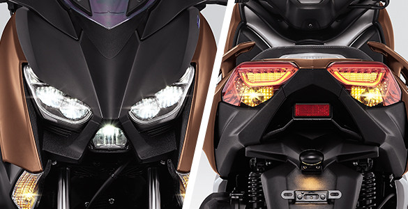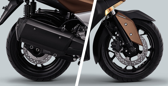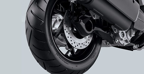 TUBELESS WIDE TIRE Berkendara lebih stabil dengan ban tubeless berukuran lebar depan 120/70-15" dan belakang 140/70-14" yang di desain khusus untuk XMAX, memberikan daya cengkram ban yang lebih sempurna di permukaan basah / kering.
